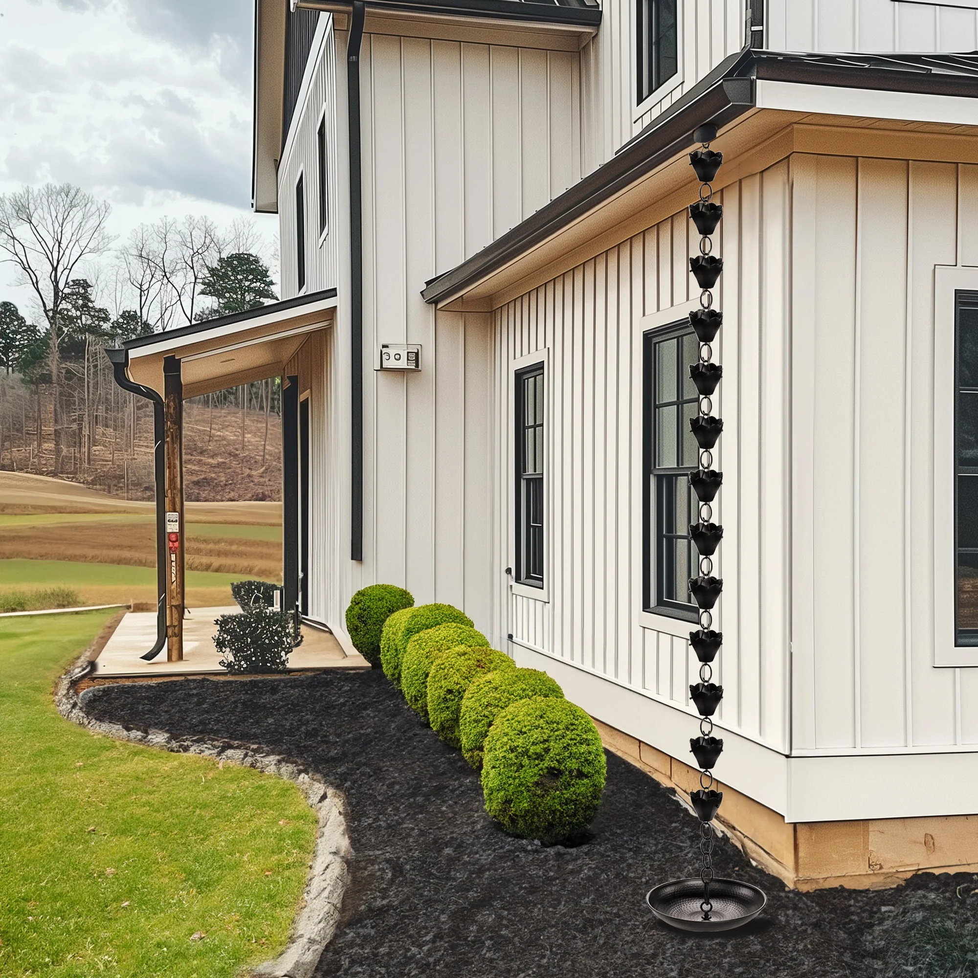 QUALITY MATERIALS - handcrafted out of aluminum with a black finish. STYLISH DESIGN - the basin is hand hammered, providing a beautiful textured look. Large connector inside the basin easily connects the rain chain in place. GOOD DIRECTIONS DIFFERENCE - because we use only the finest materials. If there is ever an issue, contact our experienced and knowledg MEASUREMENTS - 16-1/2 inch diameter x 4 inches high; Our basin is the largest in the industry, allowing it to hold more water. After connected to the rain chain, the basin lays flat on the ground. FUNCTIONAL DESIGN - this is the perfect anchor and catch basin for your rain chain; This will prevent the rain chain from blowing in heavy winds and collects the water so it can be reused in the garden; The basin lays flat on the ground and we recommend adding rocks inside the basin for a stylish look. |