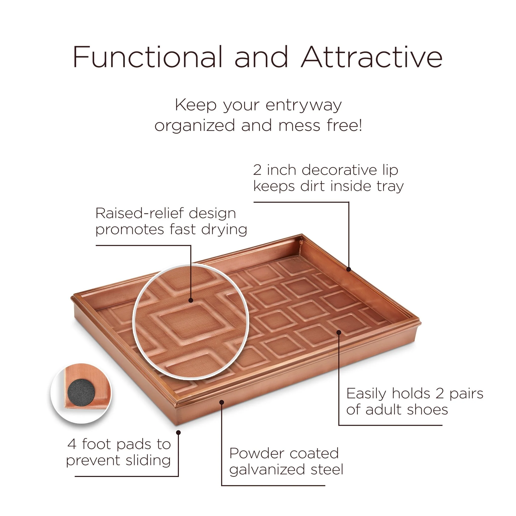 This multi-purpose boot tray is as versatile as it is attractive! Our customers use it for shoes in the entryway or mudroom to keep floors clean; as an attractive home for potted plants; or as a neat, no-mess zone for pet bowls. Pads on bottom prevent sliding. Dimensions: 20"L x 14"W x 2"H.