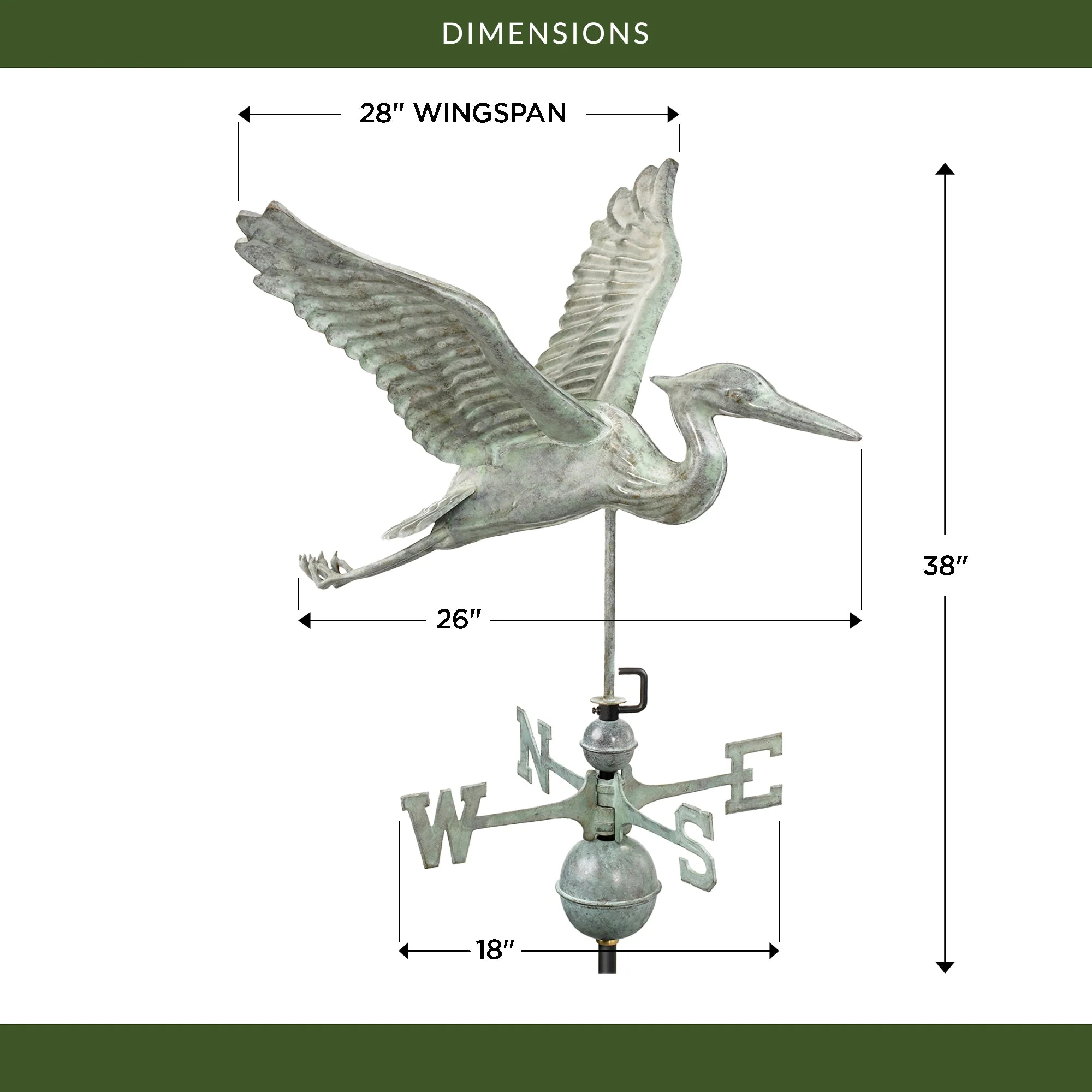 Introducing our Blue Heron Weathervane, a true work of art! This beauty is crafted with pure copper and boasts a stunning Blue Verde finish that'll make your guests do a double take. The heron stands proudly atop with its wings spread wide, while capturing all the beauty of nature. And let's not forget about that elegant tail feathers and beak, every single detail is carefully crafted to bring this majestic bird to life. So, whether you're a fan of art or love the great outdoors, this weathervane is the perfect addition to your home.