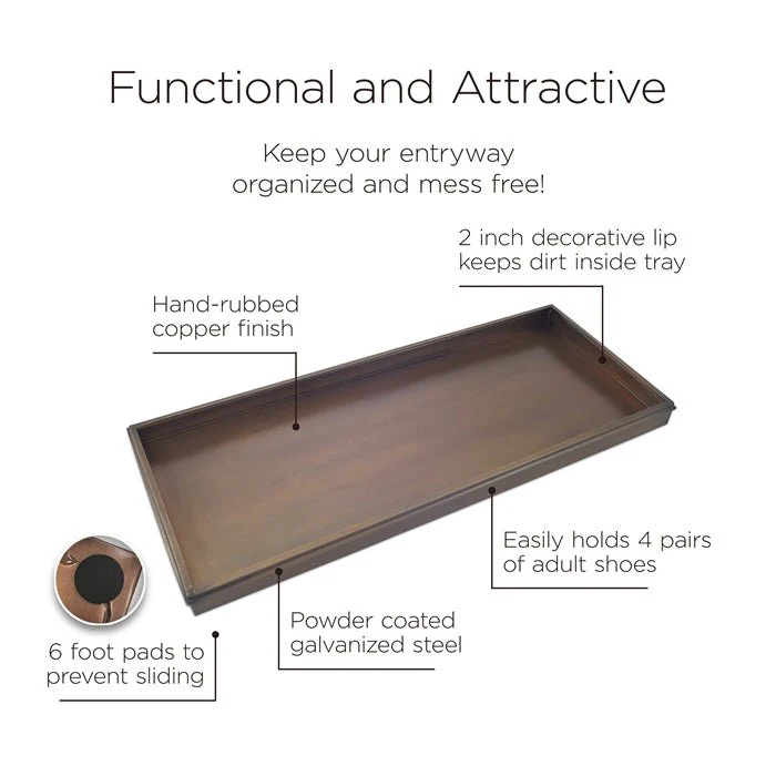 This multi-purpose boot tray is as versatile as it is attractive! Our customers use it for shoes in the entryway or mudroom to keep floors clean; as an attractive home for potted plants; or as a neat, no-mess zone for pet bowls. Pads on bottom prevent sliding. Dimensions: 34"L x 14"W x 2"H.