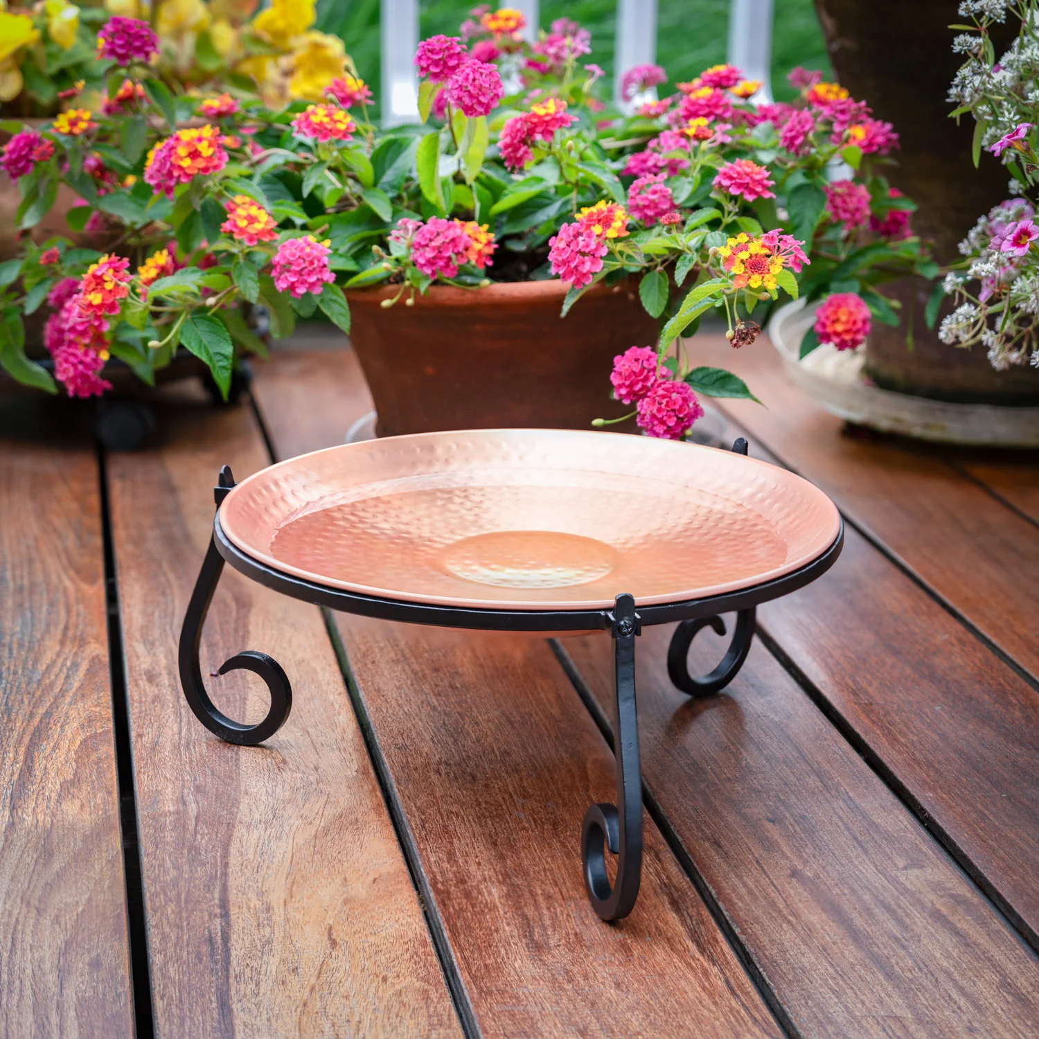 This multipurpose freestanding copper basin doubles as a bird bath or a feeder, catering to your choice. Constructed from heavy gauge copper, it features a rolled edge for added support and durability. The naturally antimicrobial plate is an ideal depth for birds to frolic in the water or serve as a communal feeding station. The hand-forged solid steel stand is easy to assemble and boasts three scrolled legs. A beautiful work of art, this piece adds charm to gardens and patios alike!