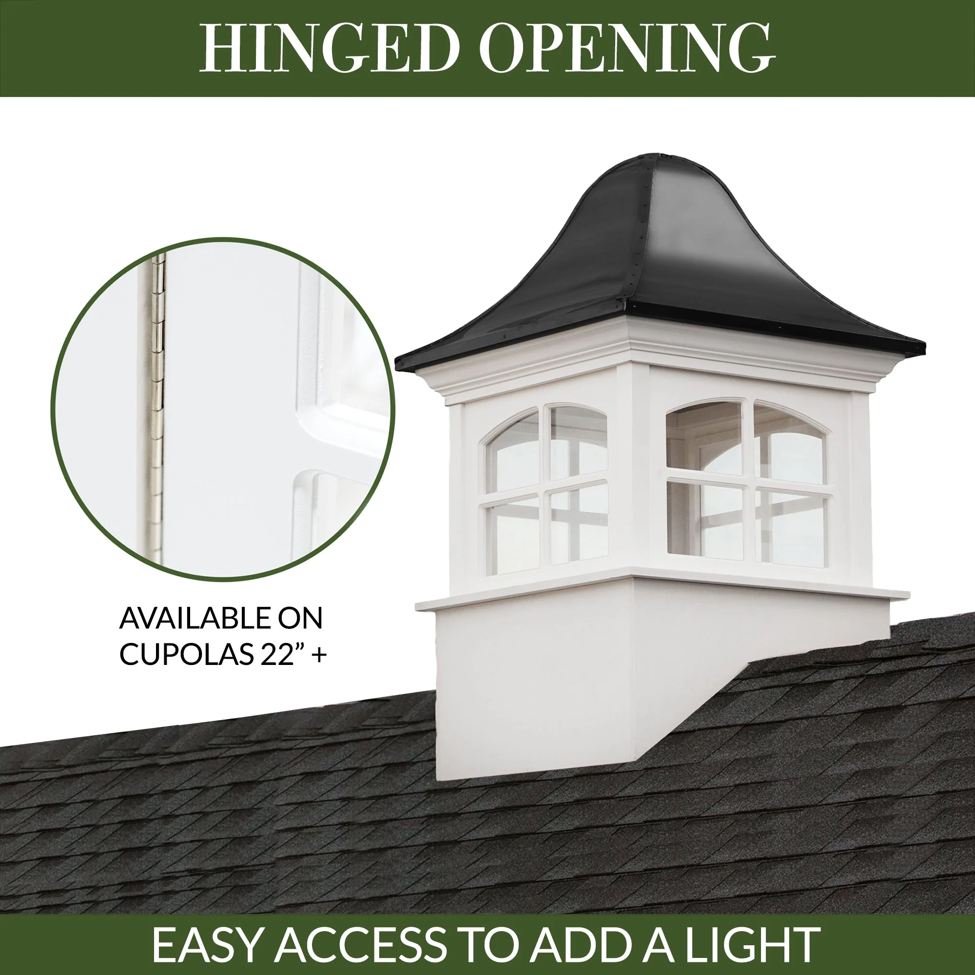 - Hinged Window - One panel of the cupola opens to add a light, or to clean. Only available on 22" square cupolas or larger.