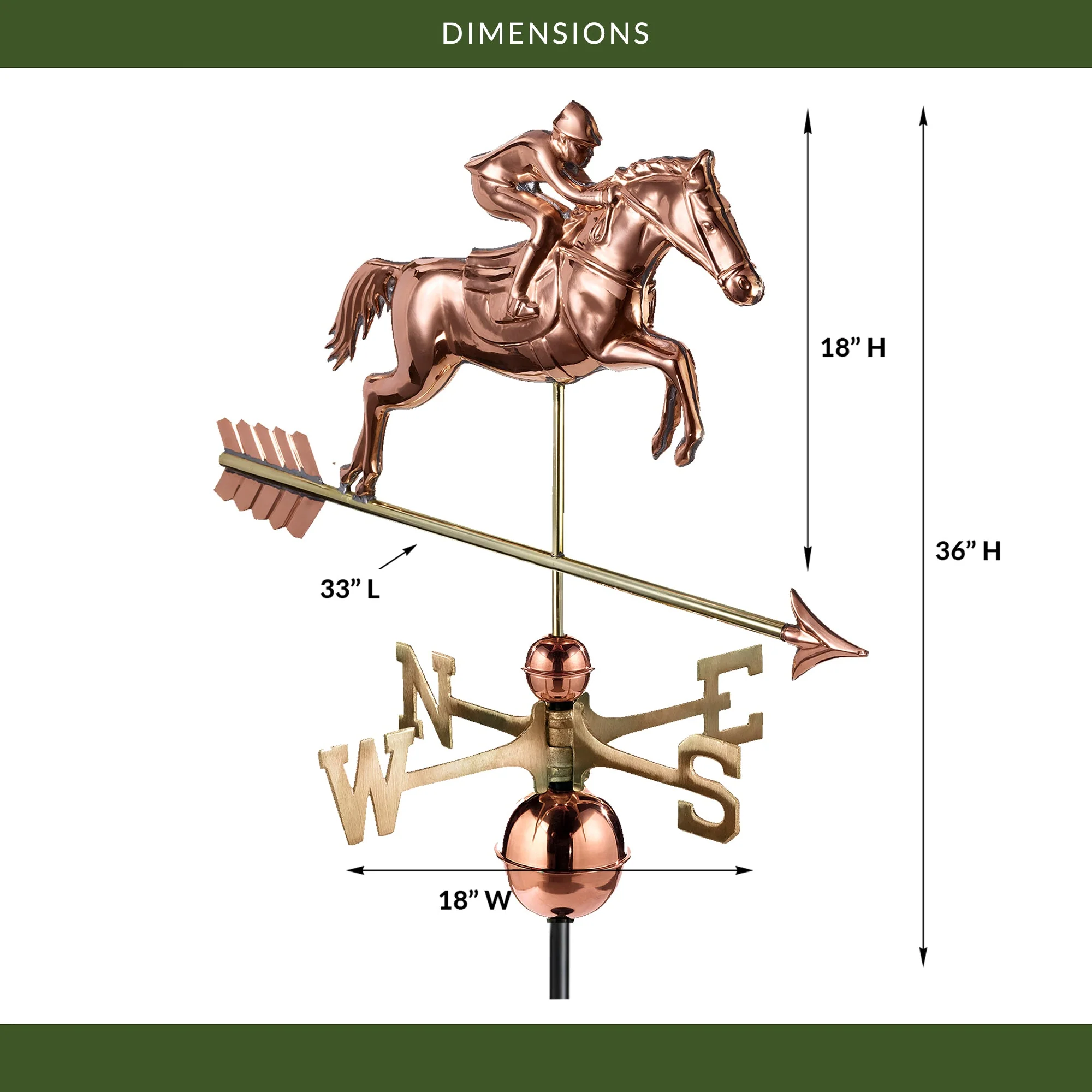 Our Jumping Horse & Rider Weathervane is a truly breathtaking sight! Every intricate detail, from the graceful arch of the horse's neck to its rider's proud stance, will take your breath away. This weathervane serves as a reminder of the strong bond that exists between an experienced horseman and their beloved steed - a founded connection of trust and respect. Upgrade your outdoor décor and bring some regal flair with this unique jumping horse and rider weathervane.