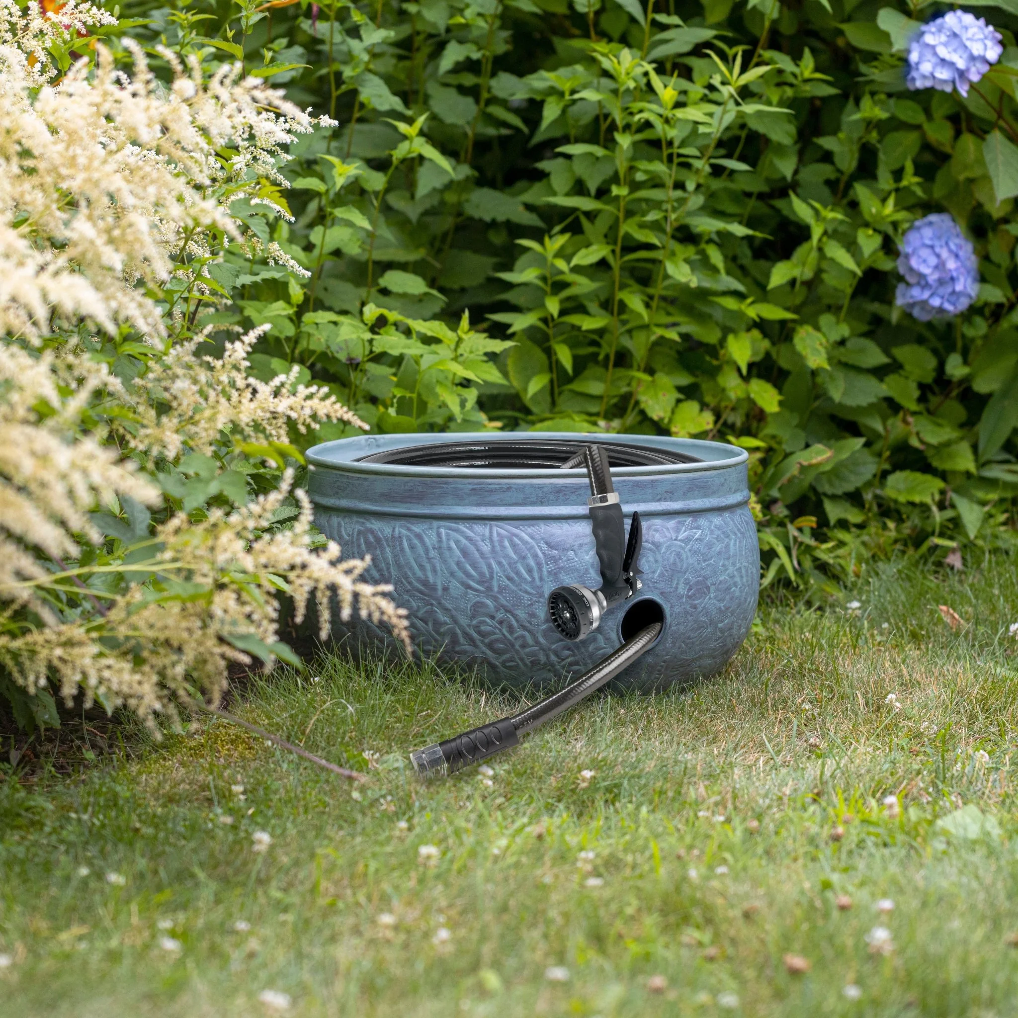Posh, yet practical, these attractive hose pots enrich the yard and garden with their style and charm. A handsome hiding spot for up to 100 feet of unruly garden hose, each pot is handmade using Old World techniques with modern innovation to create an attractive and practical outdoor accent. A raised interior base helps guide the hose within the container, while multiple drainage holes eliminate excess water. An ample side hole allows the hose to be easily connected to an outdoor faucet. These versatile containers can also be used as graceful planters, firewood containers, or impressive drink buckets sure to strike up conversation.
