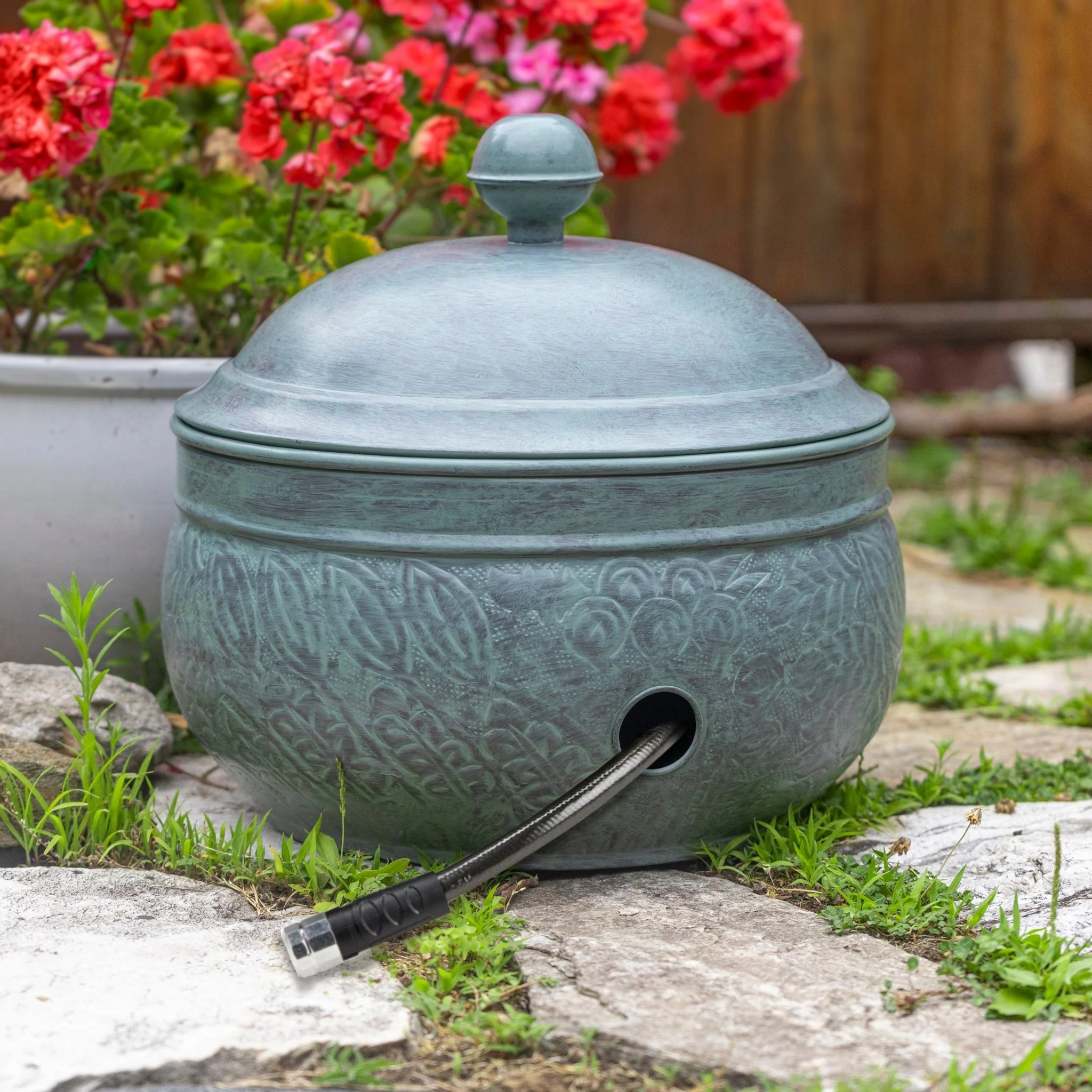 Posh, yet practical, this attractive hose pot and lid will enrich your yard and garden with its style and charm. A handsome hiding spot for up to 100 feet of unruly garden hose, each pot and lid is handmade using Old World techniques with modern innovation to create an attractive and practical outdoor accent. A raised interior base helps guide the hose within the container, while multiple drainage holes eliminate excess water. An ample side hole allows the hose to be easily connected to an outdoor faucet. This versatile container can also be used as graceful planter, firewood container, or impressive drink bucket sure to strike up conversation.