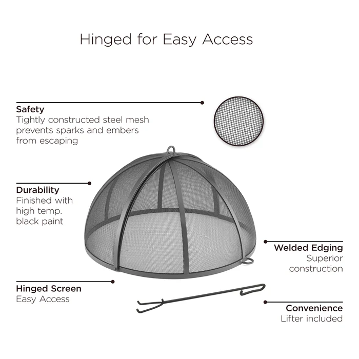 - Hinged spark screen allows easy access to the fire without the need to remove the screen and has convenient handle on top to lift the screen on and off.