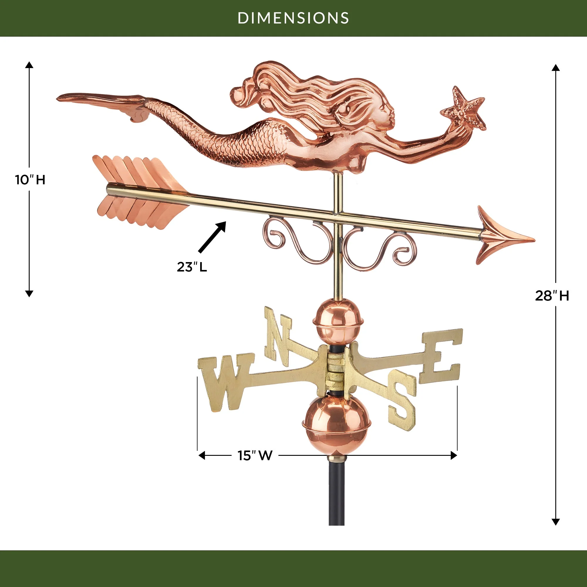 Sail into a world of enchantment with our Little Mermaid Weathervane! This stunning outdoor decor piece is an absolute must-have for anyone who loves the sea, with its intricately designed mermaid rising from the waves and holding a starfish. The copper finish is durable and glistens in the sun, bringing a touch of shine to your outdoor space. Perfect for your garden or rooftop, this weathervane is a true masterpiece that will transport you to a world of seascape adventures every time you look at it.