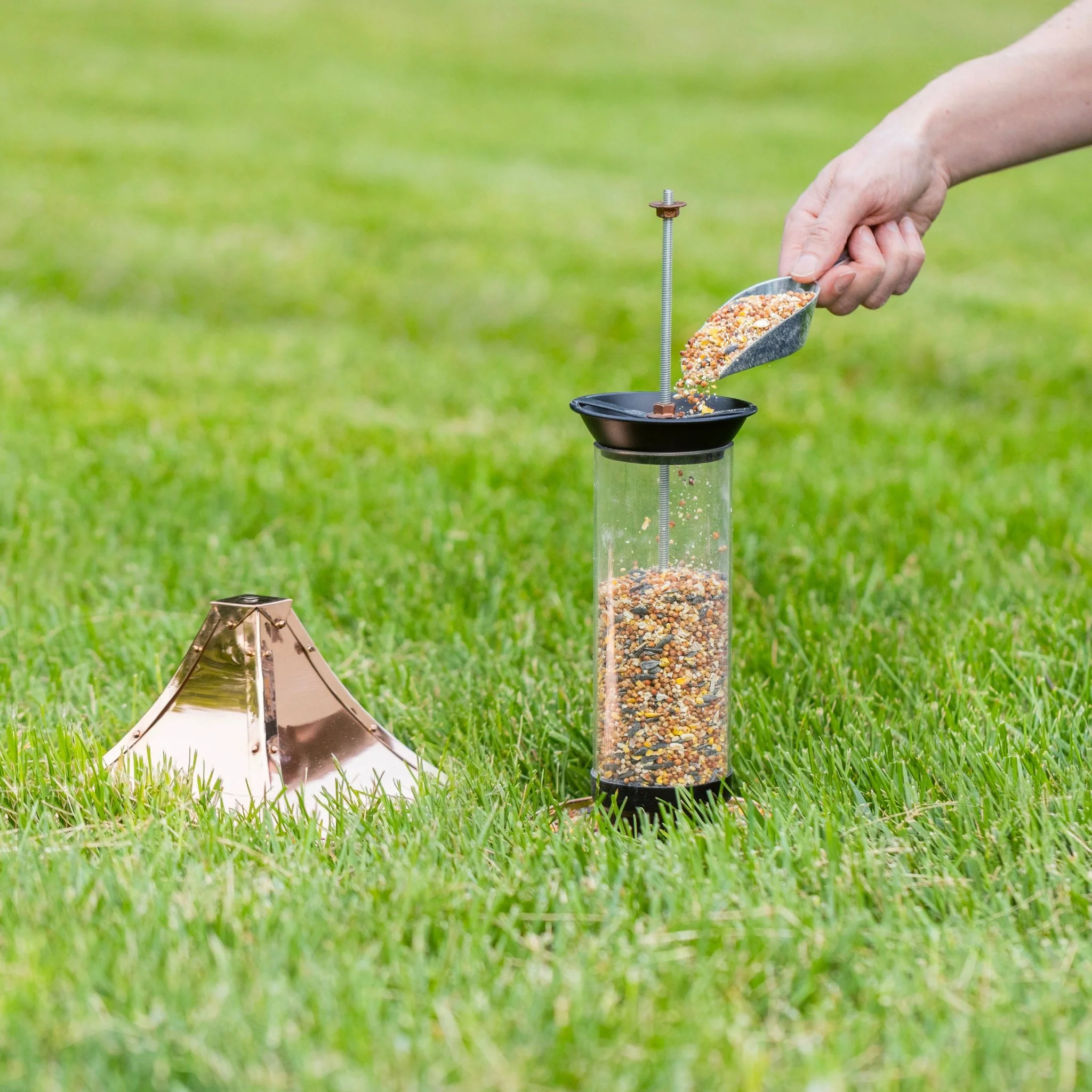Welcome to the Zen garden, where tranquility reigns supreme. And what better way to enhance your oasis than with this eastern-inspired Pagoda bird feeder. Embellished with distinctive rivets that add an elegant touch to its already graceful design, it's built to last with heavyweight plexiglass and a 22-gauge, pure copper, polished roof. Measuring 7.5“L x 7.5“W x 15.5“H, the feeder is sized to hold 1.3 pounds of seed with drainage holes to keep seeds dry. The overhang also provides our feathered friends with rain and sun protection for a peaceful dining experience!