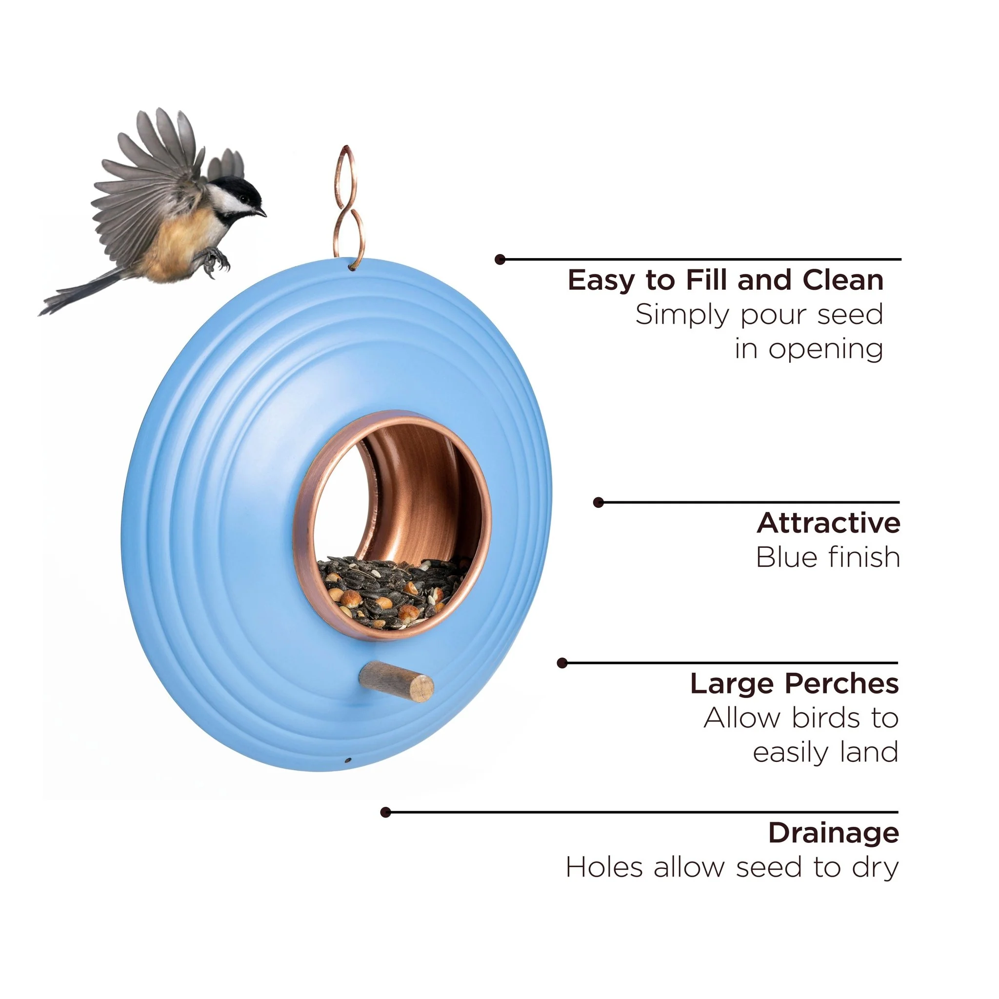 - Featuring a copper finish ring, this feeder is both beautiful and durable