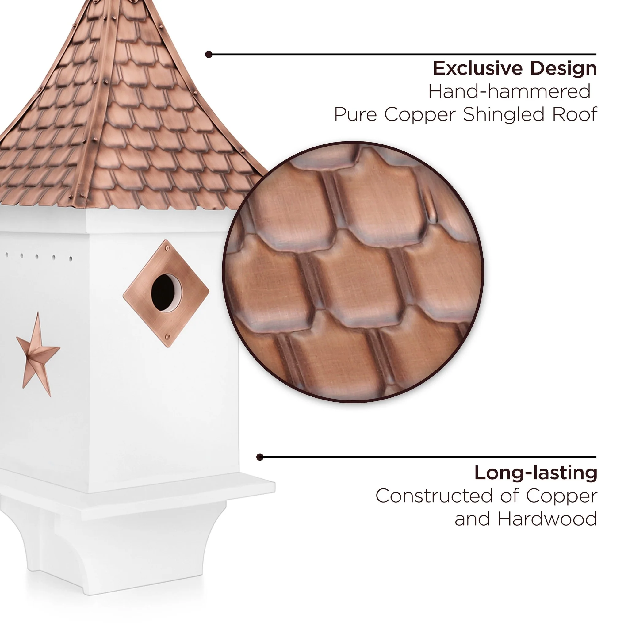 - Pure copper, shingled roof and decorative accents with a long-lasting hardwood base